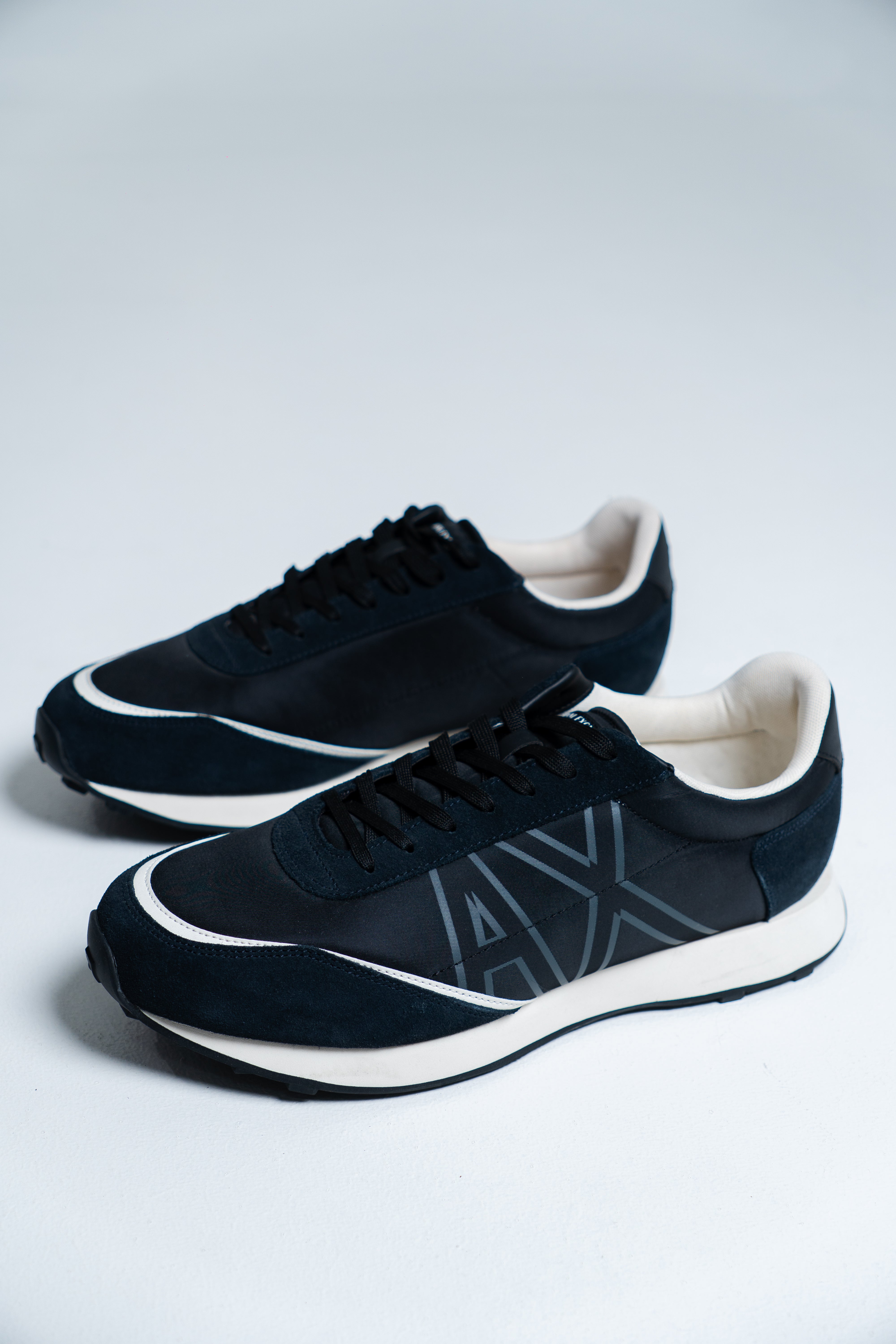 Zapatillas de la colección Armani Exchange confeccionadas en combinación de material textil, piel serraje y piel ecológica. Un modelo con un talón fuertemente rígido que estabiliza el talón y mantiene el pie en el zapato para que no se salga durante el movimiento.